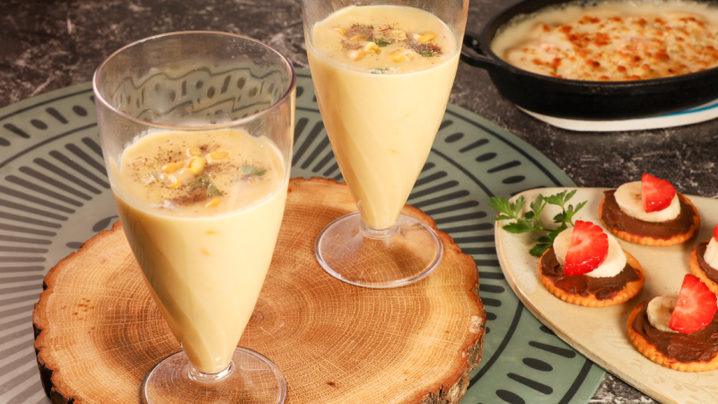 北海道産コーンを使用。素材の甘みと風味が楽しめるスープです。なめらかな口あたりのコーンスープをグラス仕立てで少し特別に。コーンの粒感と黒こしょうのアクセントが、シンプルながらも飽きのこない味わいに仕上げました。クラッカーとフルーツを添えて、軽やかなブランチやおやつにも楽しめます。