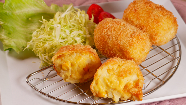 サクッとした衣の中に、とろりとなめらかなコーンクリーム。コーンのやさしい甘みがふんわり広がる、軽やかに楽しめるコロッケです。コーンスープの美味しさをそのまま閉じ込めた、満足感のある一品に仕上げました。