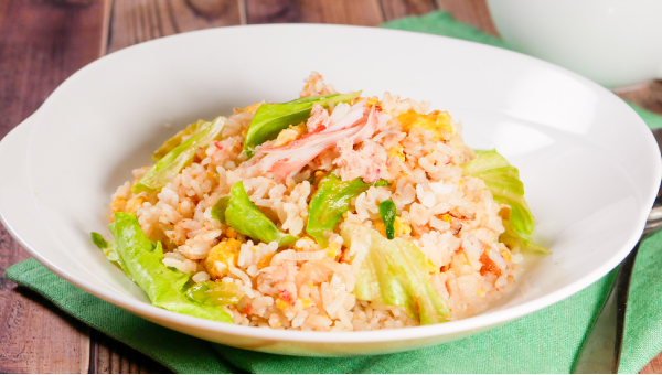 紅ズワイガニとレタスのシャキシャキ炒飯。雑炊の素を使って、旨みしっかりのカニ炒飯に仕上げました。最後にレタスを加えることで、ふんわり軽やかな食感に。和風だしは鍋肌から少しずつ加え、レタスのシャキッと感を残すのがポイントです。かにの旨みが広がる、満足感のある一皿です。