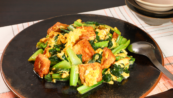凍ったまま使えるスライス厚揚げを、青菜とさっと炒めて卵でふんわりとじました。切る手間も油抜きもいらないから、忙しい日の副菜にぴったり。手早く作れて、お弁当のおかずにも便利です。やさしい味わいで、ごはんが進む一皿に仕上がります。