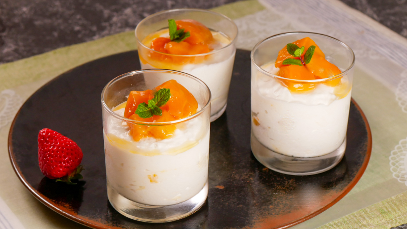 ビフィズス菌BB536を使用。とろける口どけのデザートに、彩り豊かなフルーツをのせて仕上げました。やさしい甘さとみずみずしい果実の組み合わせで、ひんやりと軽やかに楽しめる一品です。グラスに盛りつけて、いつものおやつを少し特別に。