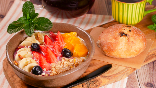 ヨーグルトで楽しむ、アサイー風モーニング。ヨーグルトにフルーツとグラノーラを合わせて、手軽にアサイーボウル風に仕上げました。いちごやバナナ、オレンジの彩りとやさしい甘みで、朝から気分が上がる一皿に。コーヒーとパンを添えて、少し特別な朝時間を楽しめます。