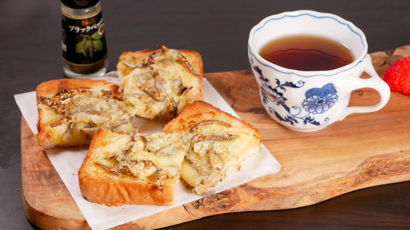 ごまごま小魚のチーズトースト。甘辛く味付けした小魚に、ごまがたっぷり。香ばしさとぷちぷち食感が楽しめます。国産かたくちいりこを使用しています。食パンにマヨネーズをぬり、ごまごま小魚とチーズをのせて焼くだけ。仕上げに黒こしょうをふれば、香ばしい風味が広がります。カリッとした小魚と、とろけるチーズがよく合う、手軽で満足感のあるトーストです。