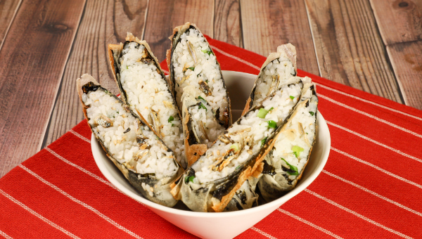 ごまごま小魚のごはん春巻き。ごまごま小魚とねぎをごはんに混ぜ、海苔と一緒に春巻きの皮で包んで焼きました。揚げずに焼くだけなので、手軽に作れるのもうれしいところ。小魚の旨みとごまの香ばしさに、海苔の風味が加わって、全体の味をぐっと引き立ててくれます。外はパリッと、中はふんわり。ちょっと楽しいごはんアレンジです。