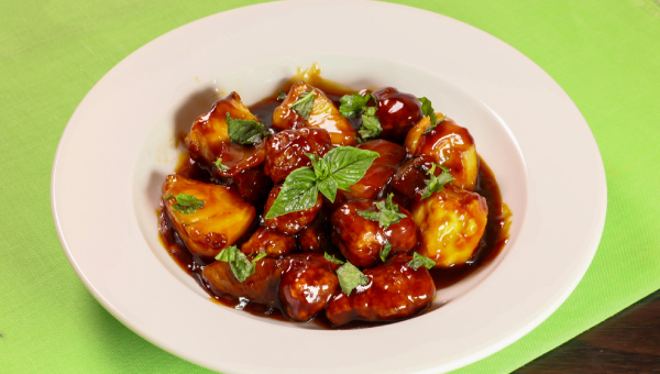バナナやパイナップルなど、酸味のあるフルーツを加えるアレンジで、甘さと酸味のバランスが絶妙に調和し、フルーティーな風味が広がります。フルーツは黒酢ソースと一緒に軽く煮ることで、ソースの旨味がたっぷり染み込みます。