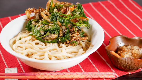 サクッと揚げた春菊や舞茸の香ばしさが、つるっとしたうどんにからむ一杯。にんじんや玉ねぎの甘みが広がり、揚げたてのかき揚げがだしの旨みをいっそう引き立てます。ほっとする贅沢な天ぷらうどんです。