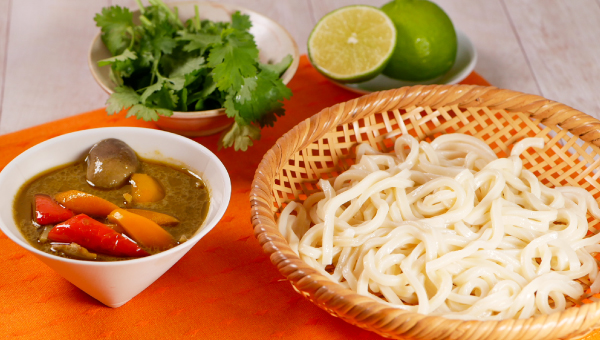 袋のまま電子レンジでOKだから、下準備がとってもラク。細うどんなので、ざるでもかけでも使いやすく、つるっと心地よいのどごしが楽しめます。その細麺をグリーンカレーのコクと辛みでいただく、手軽なのに新鮮なおいしさのアジアン風ざるうどん。パクチーやライムを添えれば、ぐっと本格的な味わいに。