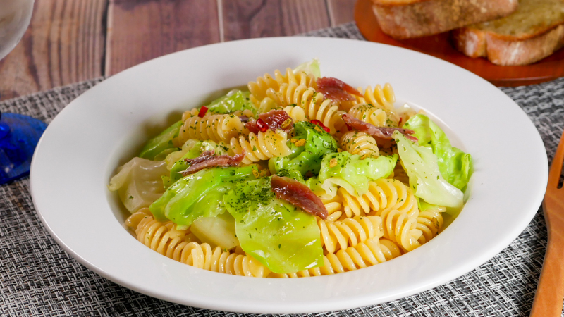 あえるだけで、手軽に本格。フライドガーリック、パセリ、唐辛子を合わせたソースは、4種のにんにくが織りなす香ばしさと、赤唐辛子のピリッとした辛み、アンチョビの旨みが重なる大人の味。甘みが増す冬キャベツと合わせるだけで、コクと香りが一層引き立ちます。ひと口ごとに旨みと香りが広がる、後引くおいしさのペペロンチーノです。