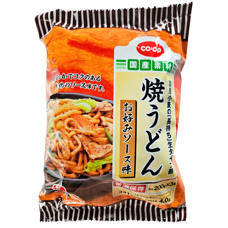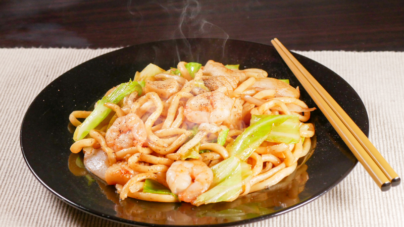 国産小麦を使った「長持ち」生タイプ麺。まろやかでコクのある、やや甘めのソース味です。今回は、海鮮バター焼うどんに。もちっとした食感の麺に、お好みソースのコク、えびやイカの旨み、そしてほんの少しのバターを加えて、奥行きのある味わいに仕上げました。いつもの焼うどんが、少し大人っぽい一皿に。
