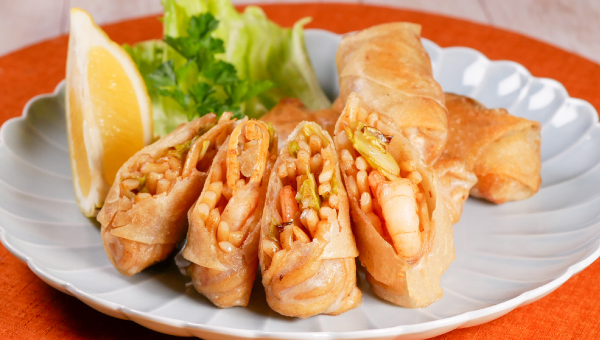 海鮮焼うどんのパリパリ春巻き。お好みソース味の焼うどんを春巻きの皮で包み、こんがり揚げました。外はサクッと、中はもちっとした食感が楽しい一品です。いつもの焼うどんが、ちょっと遊び心のあるおかずに。おつまみにもぴったりです。パリッと揚がった春巻きは、思った以上に食べごたえも。ついビールが進んでしまう一品です。