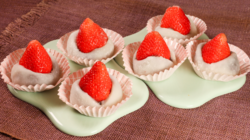 水ようかんやお汁粉など、さまざまな和菓子づくりにお使いいただけます。おすすめは、いちご大福。やわらかなお餅にこしあんといちごを包んだ、見た目もかわいらしい和菓子です。いちごの先を見せて包むと、華やかな仕上がりに。電子レンジで手軽に作れるのもうれしいポイントです。