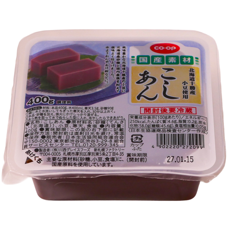 北海道十勝産小豆を使用したこしあんです。風味豊かな十勝産小豆に北海道産砂糖と国内産塩を加え、後味よく仕上げました。
