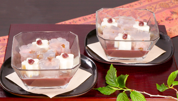 水ようかんの上に、ミルク寒天と桜の花を閉じ込めた寒天を添えた、春らしい一品。やさしい甘さの水ようかんに、ミルク寒天のまろやかさと桜寒天のさっぱりとした口当たりが重なります。見た目も涼やかで、季節を感じる和のデザートです。