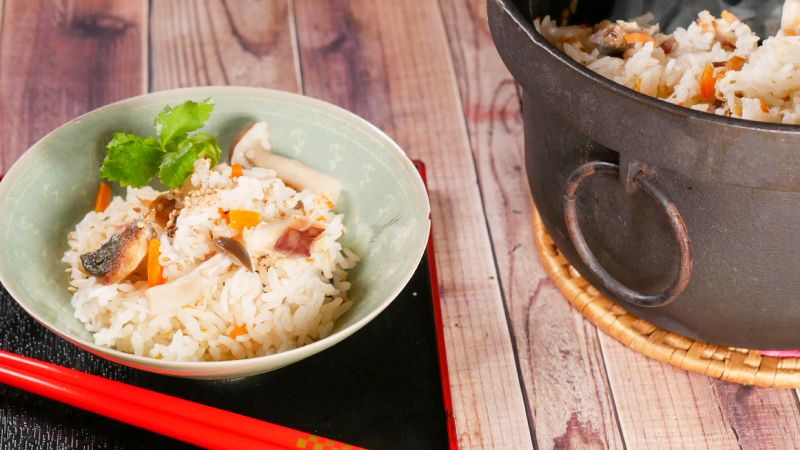にんじんやきのこなどの具材と焼いたあじをのせて炊飯します。