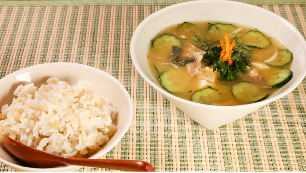 鯵の干物で仕立てる、春の冷や汁。茗荷の代わりに新玉ねぎを加え、やわらかな甘みを添えました。ごはんは別に盛り、食べる直前にそっとかけて。大きめにほぐした鯵の旨みと、焼き味噌の香ばしさ、ほのかなゆずの香りが広がります。