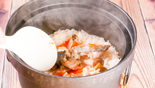 炊き上がったらあじをほぐし、全体をさっくりと混ぜ合わせます。
