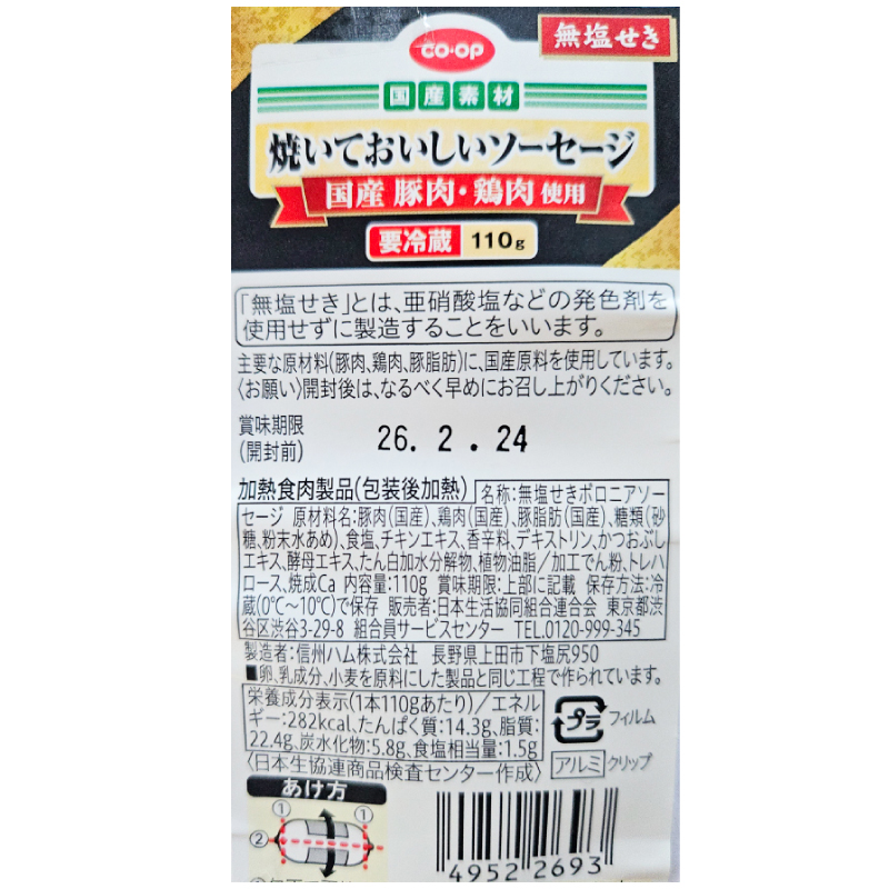 CO・OP 焼いておいしいソーセージ(国産豚肉・鶏肉使用) 110g×2