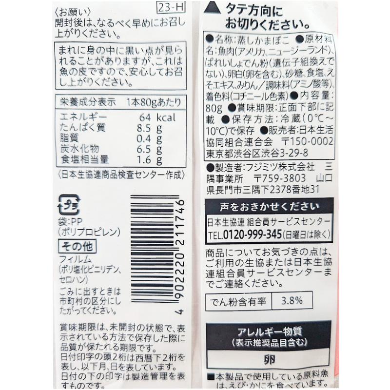 CO・OP かまぼこ(赤) 80g 2026.04.03 イベント 夕食 家飲み 料理 昼食 朝食 間食 閲覧数:6 JAN:4902220211746保存方法:冷蔵(0℃~10℃)内容量:80g 調理のポイント ・開封後はお早めにお召し上がりください。・まれに身の中に黒い点が見られることがありますが、魚の皮によるものですので、安心してお召し上がりください。
