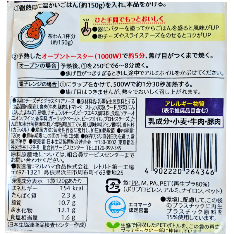 CO・OP チーズデミグラスドリアソース 1人前120g×3P 2026.02.20 イベント 夕食 料理 昼食 閲覧数:10 JAN:4902220258802保存方法:直射日光を避け、常温内容量:1人前120g×3P 調理のポイント ①耐熱皿に温かいごはん(約250g)を入れ、本品をかける。・器にバターを塗ってからごはんを盛ると風味がUP・粉チーズやスライスチーズをのせるとコクがUP②予熱したオーブントースター(1000W)で約5分、焦げ目がつくまで焼く。・オーブンの場合:予熱後、①を250℃で6〜8分焼く。・電子レンジの場合:①にラップをかけて、500Wで約1分30秒加熱する。