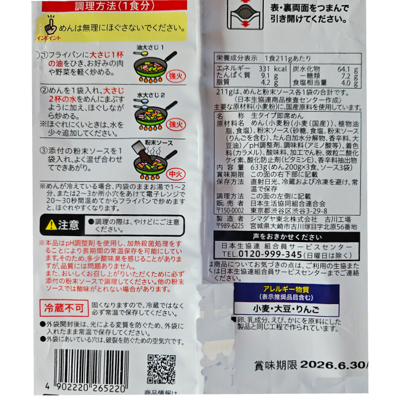 CO・OP 焼うどん お好みソース味 めん200g×3食 2026.02.28 イベント 夕食 家飲み 昼食 間食 閲覧数:5 JAN:4902220265220保存方法:直射日光、冷蔵および冷凍を避け、常温内容量:200g×3食 調理のポイント ※めんは無理にほぐさないでください。① フライパンに油大さじ1を熱し、お好みの肉や野菜を軽く炒めます。② めん1袋を加え、水大さじ2を全体にまぶすように加え、ほぐしながら炒めます。 ※ほぐれにくい場合は、水を少量ずつ追加してください。③ 添付の粉末ソースを1袋加え、よく混ぜ合わせて出来上がりです。