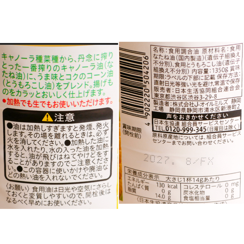 CO・OP キャノーラ油&コーン油(一番搾りキャノーラ油使用) 1350g 2026.04.03 夕食 家飲み 料理 昼食 朝食 間食 閲覧数:8 JAN:4902220504206保存方法:直射日光等強い光を避け、常温内容量: 1350g 調理のポイント ・加熱調理にも、生のままでもお使いいただけます。・油は加熱しすぎると発煙・発火の恐れがあります。調理中にその場を離れる際は、必ず火を消してください。・加熱した油に水を入れたり、水分が残った状態で加熱すると、油がはねてやけどの原因になりますのでご注意ください。・この容器に、使いかけや廃油などの熱い油を入れないでください。